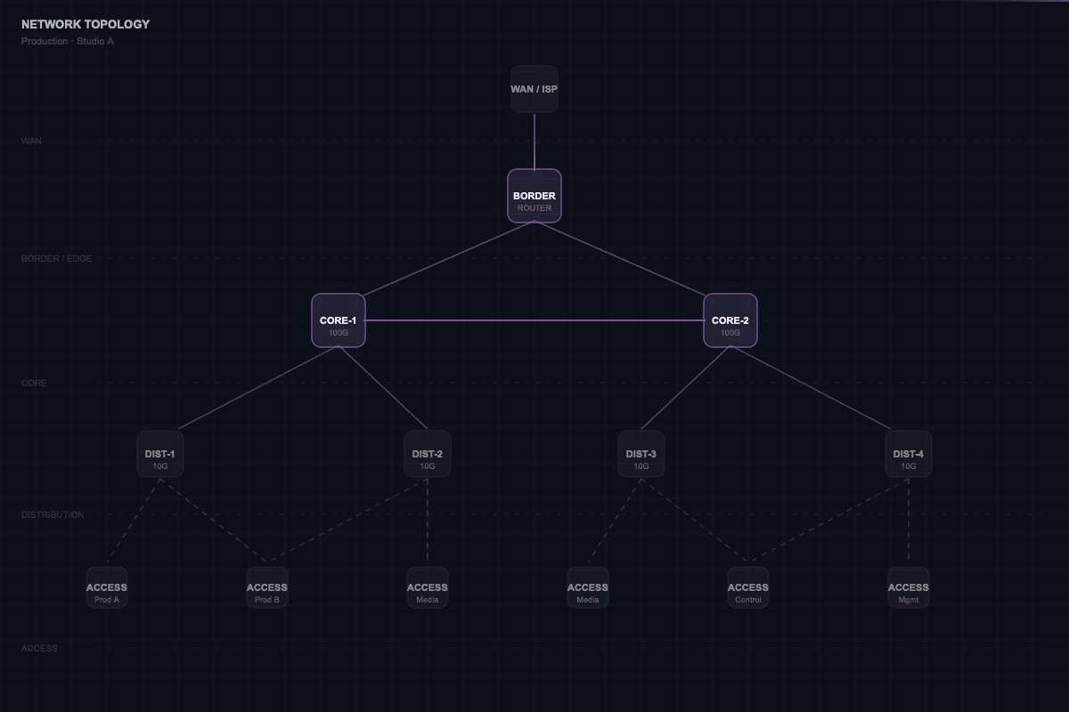 End-to-end architecture for IP media, control, and management networks — sized and structured for your workflow.