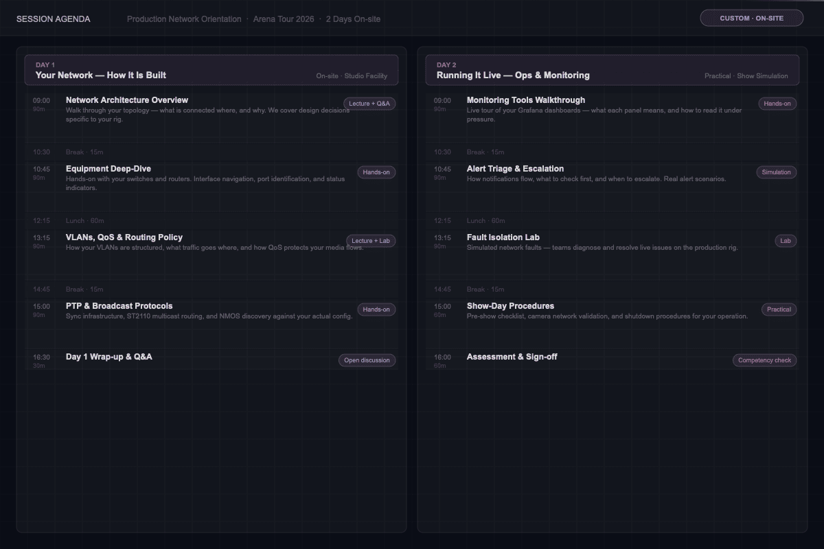 Training built around your exact rig — your switches, your topology, your workflows. Relevant from day one.