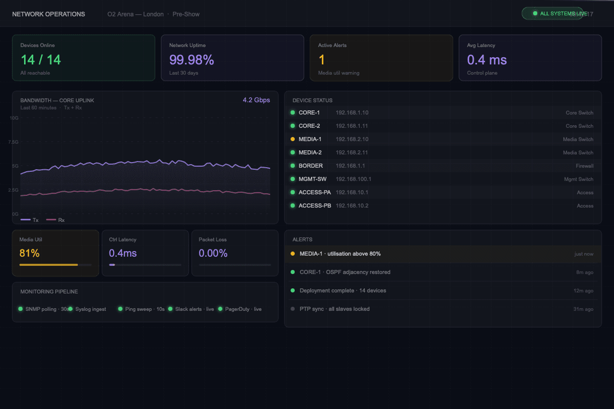We work closely with your team to design networks that fit your production — not the other way around. Whether you're planning a touring rig, a permanent broadcast facility, or a one-off event, we scale our approach to match.
